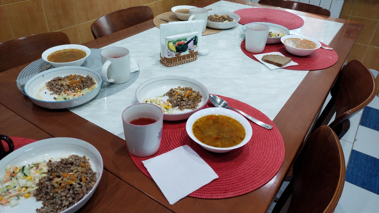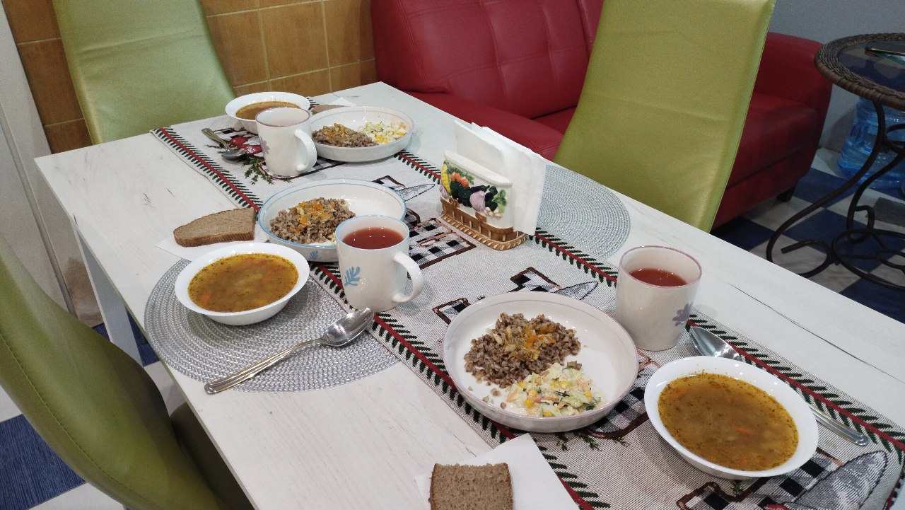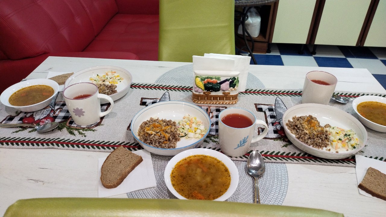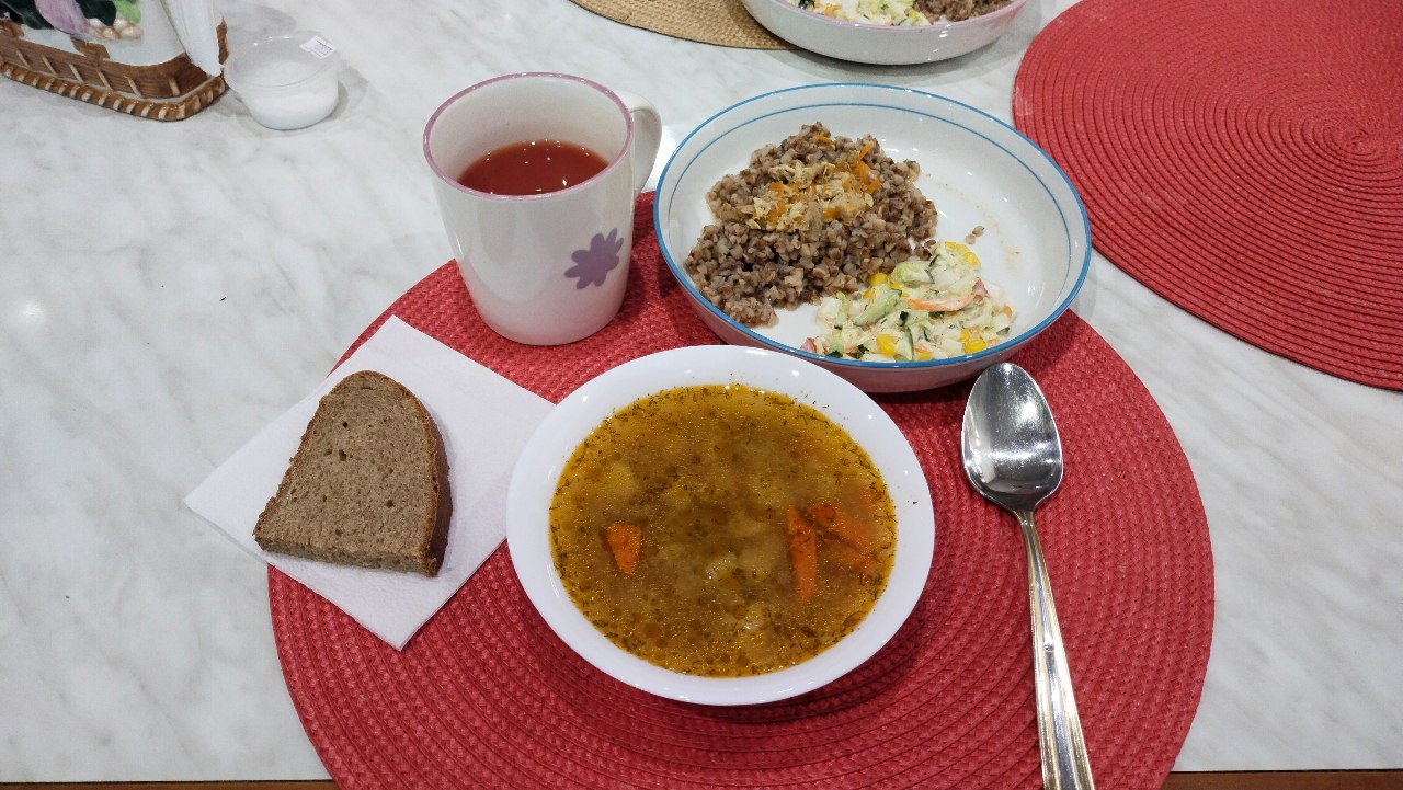 Обед: овощной суп, рыба на пару с гречкой, салат из свеклы.